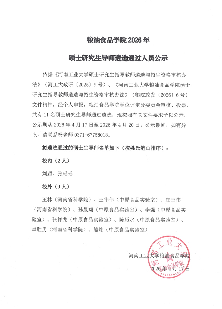 依据《河南工业大学硕士研究生指导教师遴选与招生资格审核办法》(河工大政研〔2025〕9号)、《河南工业大学粮油食品学院硕士研究生指导教师遴选与招生资格审核办法》(粮院政发〔2026〕6号)文件精神,经个人申报,粮油食品学院学位评定分委员会审核、投票,共有11名硕士研究生导师通过遴选,现按照有关文件要求予以公示,公示期从2026年4月17日至2026年4月20日。公示期间,如有异议,请联系杨老师0371-67758018。