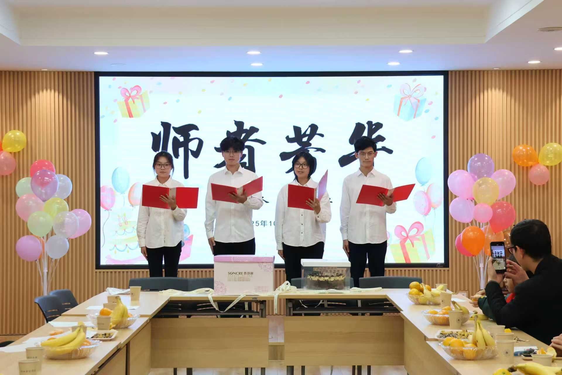 随后,各位老师依次分享了工作感悟与生活期许,言语间流露着对教育事业的热爱与对学院未来的信心。学生代表深情朗诵原创诗歌《师者芳华》,以“三尺讲台育桃李,一生秉烛铸师魂”的深情语句,表达对恩师的敬仰与祝福。学生合唱团献上改编版《生日快乐歌》,巧妙融合《感恩的心》与《亲爱的你啊》的旋律,用青春嗓音传递真挚情谊,现场掌声与感动交织。