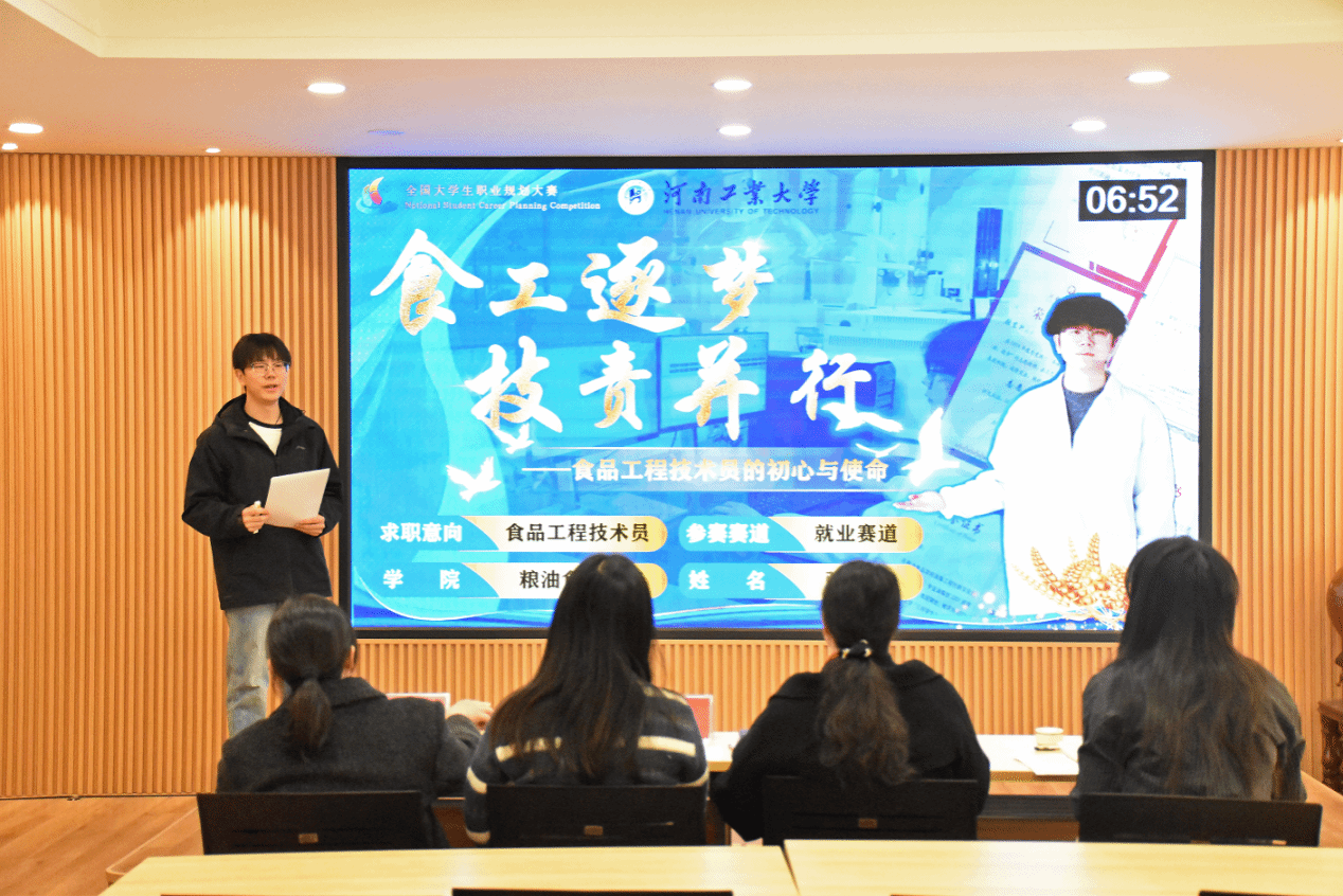 本次院赛以“规划职业蓝图,赋能青春成长”为宗旨,聚焦学生职业发展核心需求,为学子们搭建了展示职业规划成果、交流成长思路的优质平台。比赛中,参赛选手依次登台,通过PPT演示与现场演讲,从自我认知、职业定位、发展路径、实施策略等方面,全面阐述个人职业规划构想。选手们紧扣粮食学院专业特色,结合行业发展趋势,展现出清晰的职业思考与积极向上的奋斗姿态。