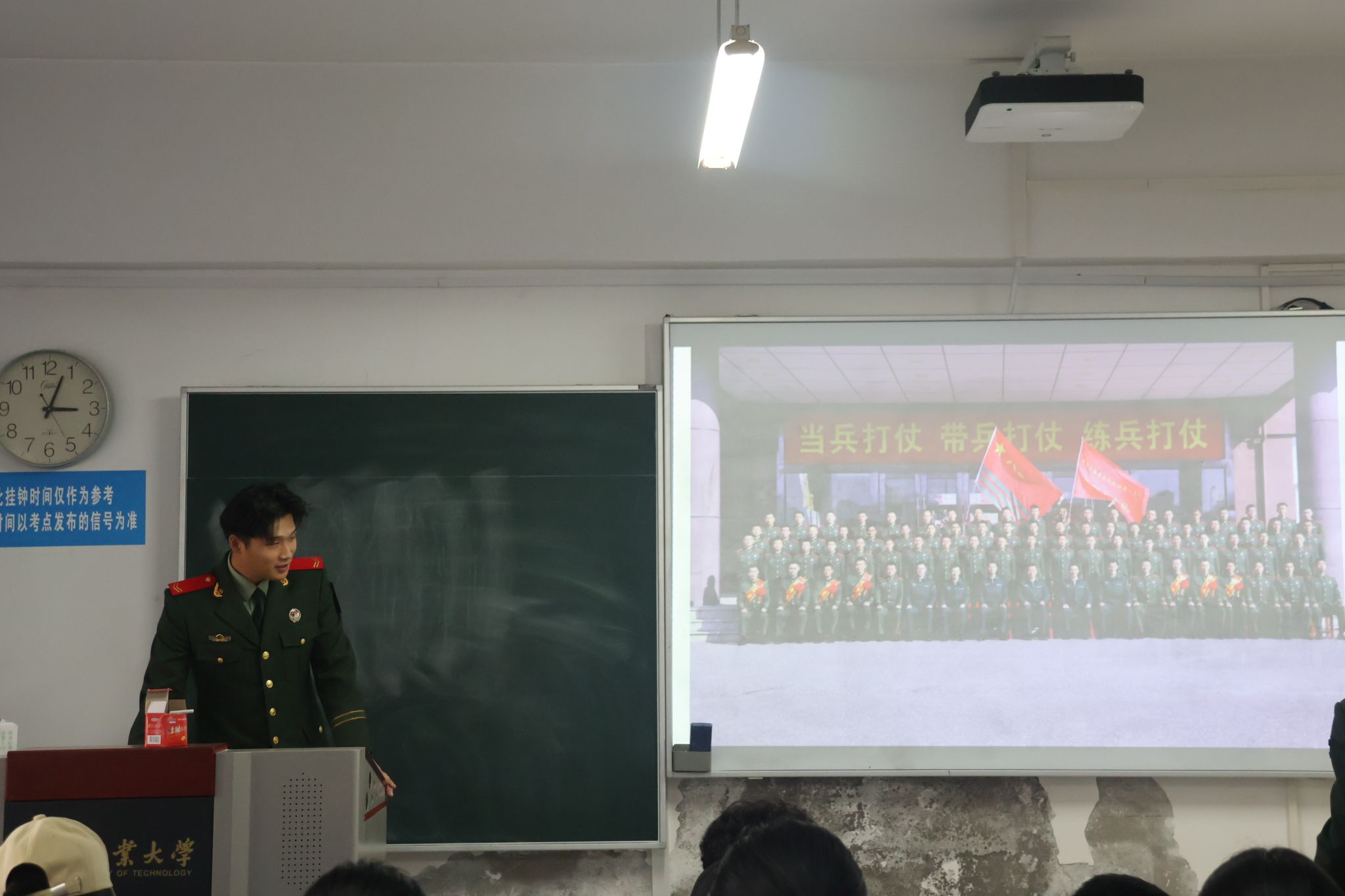 陈勇以自身军旅经历为引,拉开活动序幕。在宣讲环节,陈勇率先分享了自己从校园走向军营的蜕变历程,从新兵连的严苛训练到执行任务时的责任担当,从战友间的同甘共苦到退役后的初心坚守,生动讲述了军营生活如何锤炼意志、塑造品格,让在场学生真切感受到“当兵两年,受益一生”的深刻内涵。