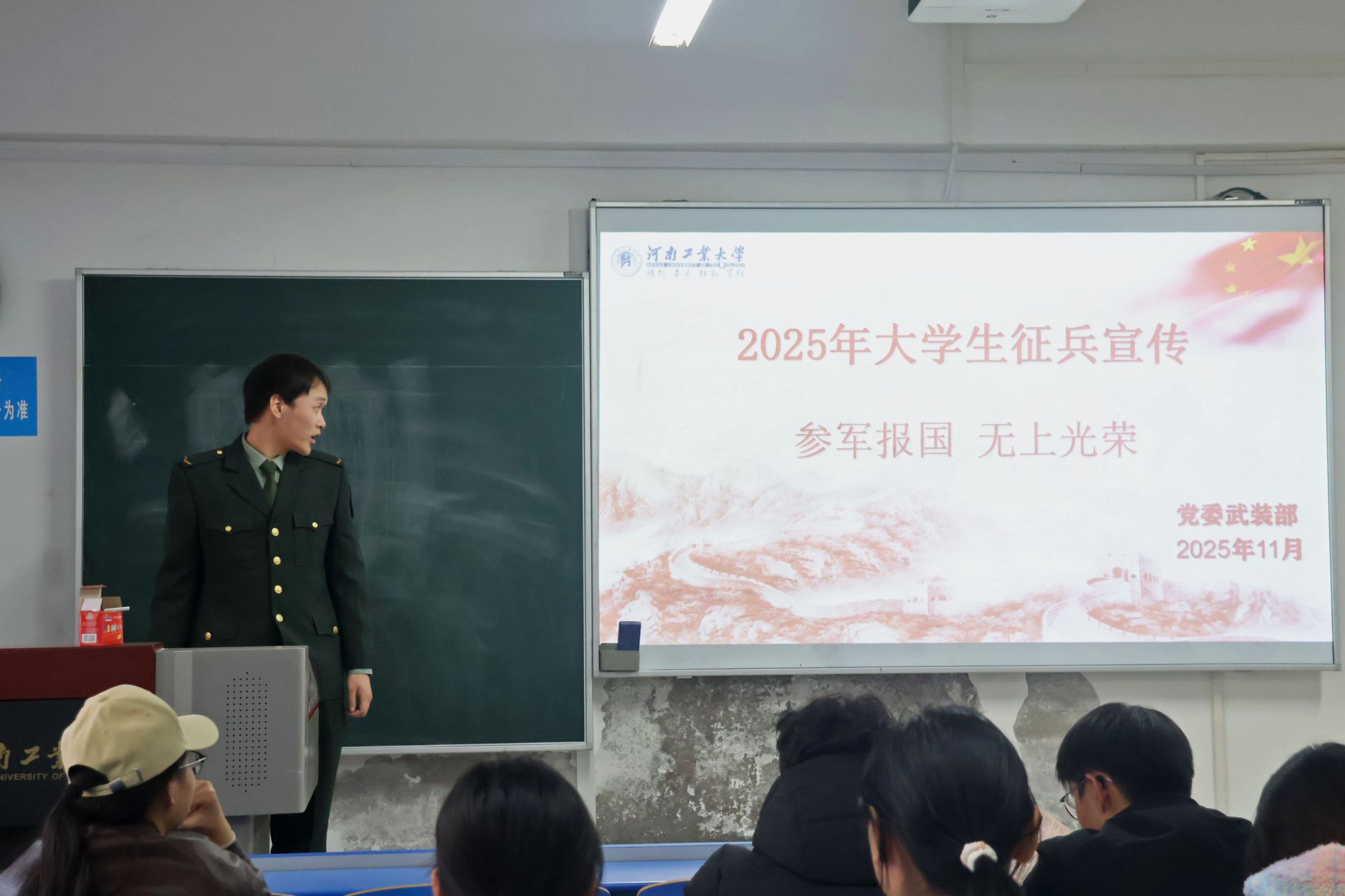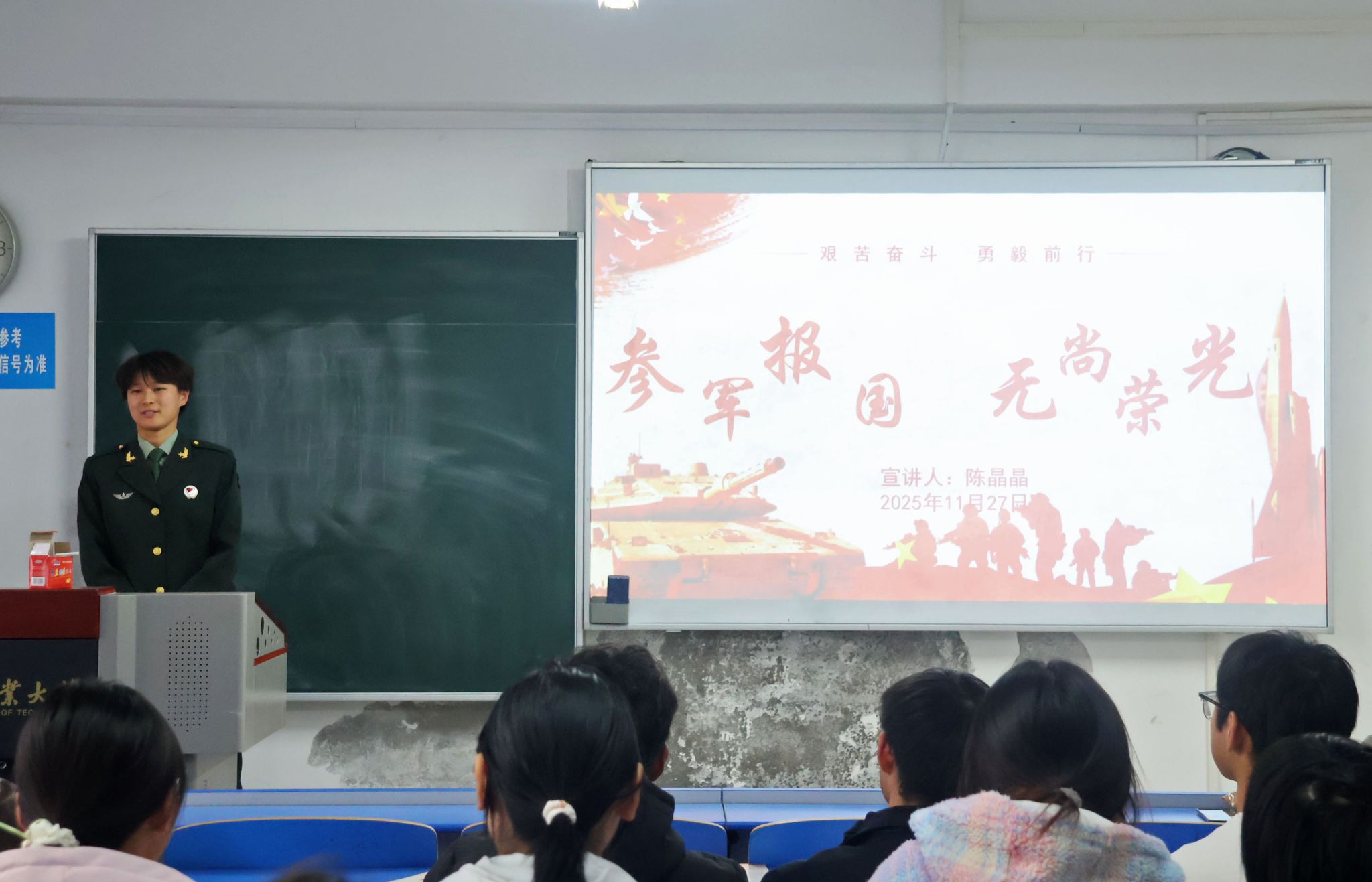 为深入贯彻习近平强军思想,激发青年学子参军报国热情,拓宽成长成才通道,11月27日下午,粮油食品学院在惟实楼举办征兵宣讲会。学院辅导员杨晋杰与众多学生齐聚一堂,共同聆听宣讲。本次宣讲会由粮油食品学院退役大学生陈勇主持。