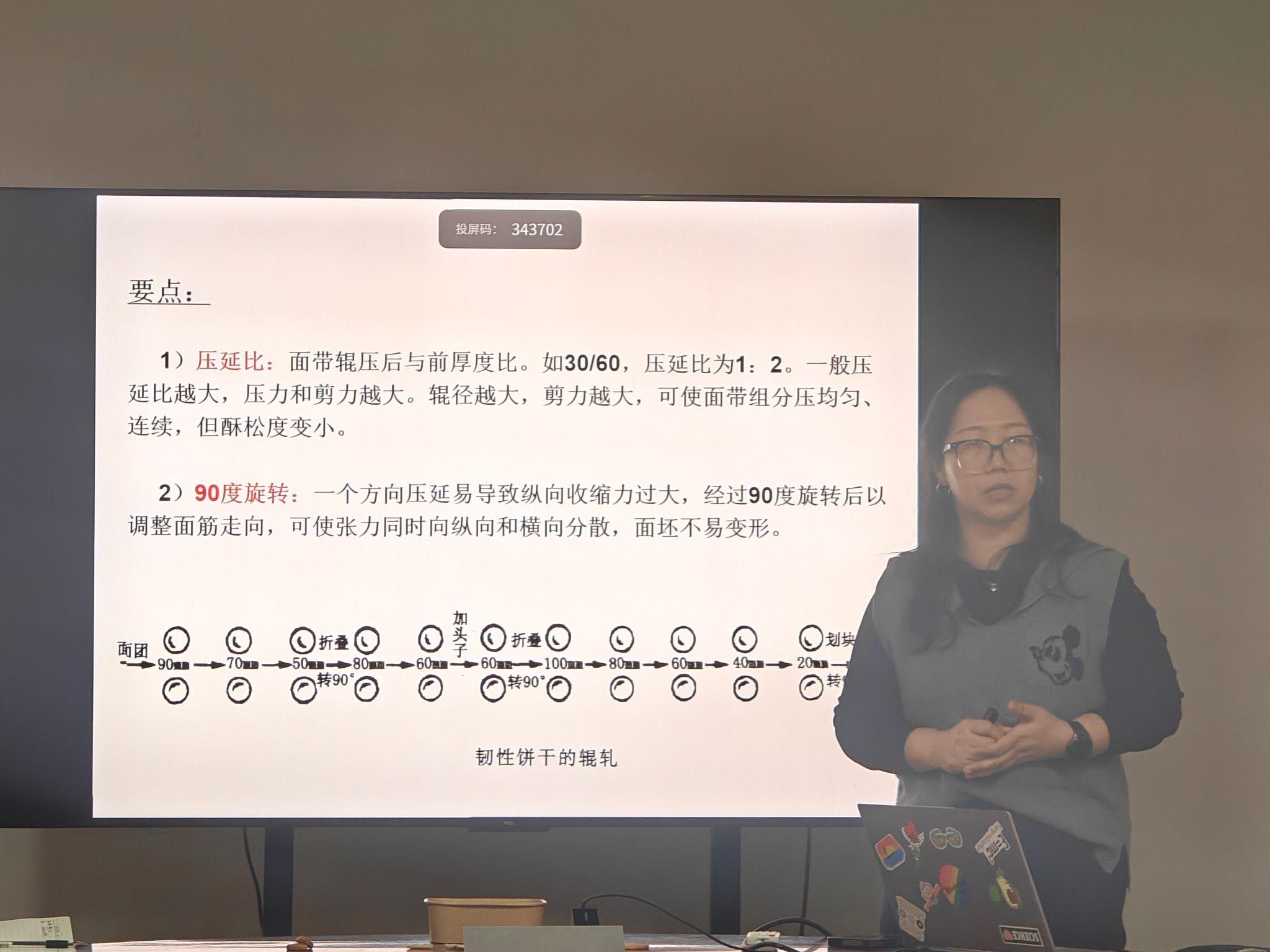 本次观摩课由吕莹果副教授主讲,课程内容为“饼干加工工艺”。吕老师通过生动的案例和清晰的工艺流程演示,系统讲解了从原料配比、面团调制、成型烘烤到品质控制的关键技术要点,并结合现代食品工业中的智能化生产线视频,深入浅出地阐述了饼干加工中的科学原理与工程实践。课堂氛围活跃,师生互动频繁,充分展现了理论与实践相结合的教学特色。