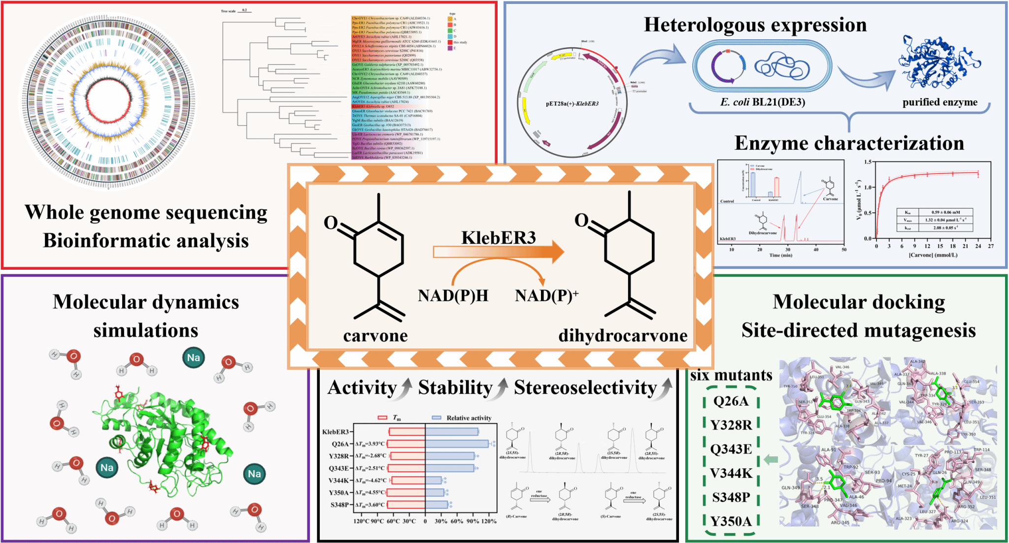 二氢香芹酮具有怡人的香气和多样的生物活性,已被广泛应用于食品、化妆品、药品及精细化学品生产、农业生产和粮油储藏,综合市场需求量大。酶催化因具有立体选择性高且环境友好等优势,已成为生产二氢香芹酮的重要方法之一。该研究基于团队前期筛选得到的菌株,通过生物信息学手段挖掘到潜在的香芹酮烯还原酶KlebER3。经异源表达和蛋白纯化,系统表征了香芹酮烯还原酶KlebER3,并通过计算机辅助手段结合定点突变技术进一步获得了催化活性、稳定性及立体选择性显著提升的突变体。最后利用分子动力学模拟揭示了其活性和稳定性增强的潜在机制。本研究表征的烯还原酶展现出卓越性能,具有较强工业规模应用的潜力;并通过拓展烯还原酶资源库,为后续合成生物学和基因工程应用奠定基础。