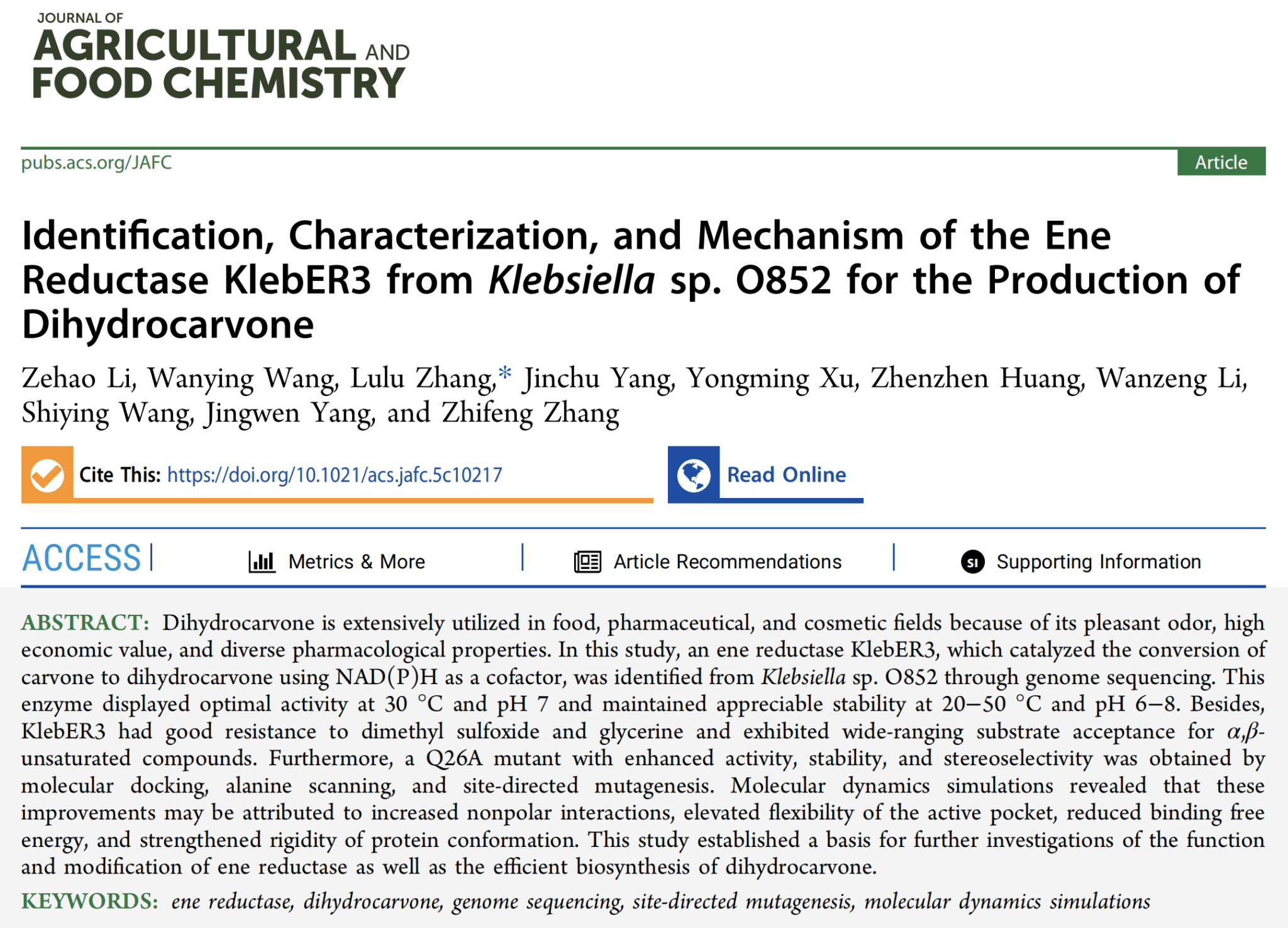 近日,我校粮油食品学院师生在国际食品Top期刊《Journal of Agricultural and Food Chemistry》(中科院一区TOP)在线发表题为Identification, Characterization, and Mechanism of the Ene Reductase KlebER3 from Klebsiella sp. O852 for the Production of Dihydrocarvone的研究论文。学院张璐璐副教授为通讯作者,2022级本科生李泽浩为第一作者,河南工业大学粮油食品学院为第一署名单位和唯一通讯单位。这一成果不仅彰显了粮油食品学院科研高质量发展的强劲动能,更是食品学科交叉研究取得突破性进展的标志性范例,充分展现了学院在本科生人才培养与学科建设一体化推进中的系统性创新与卓越成效。