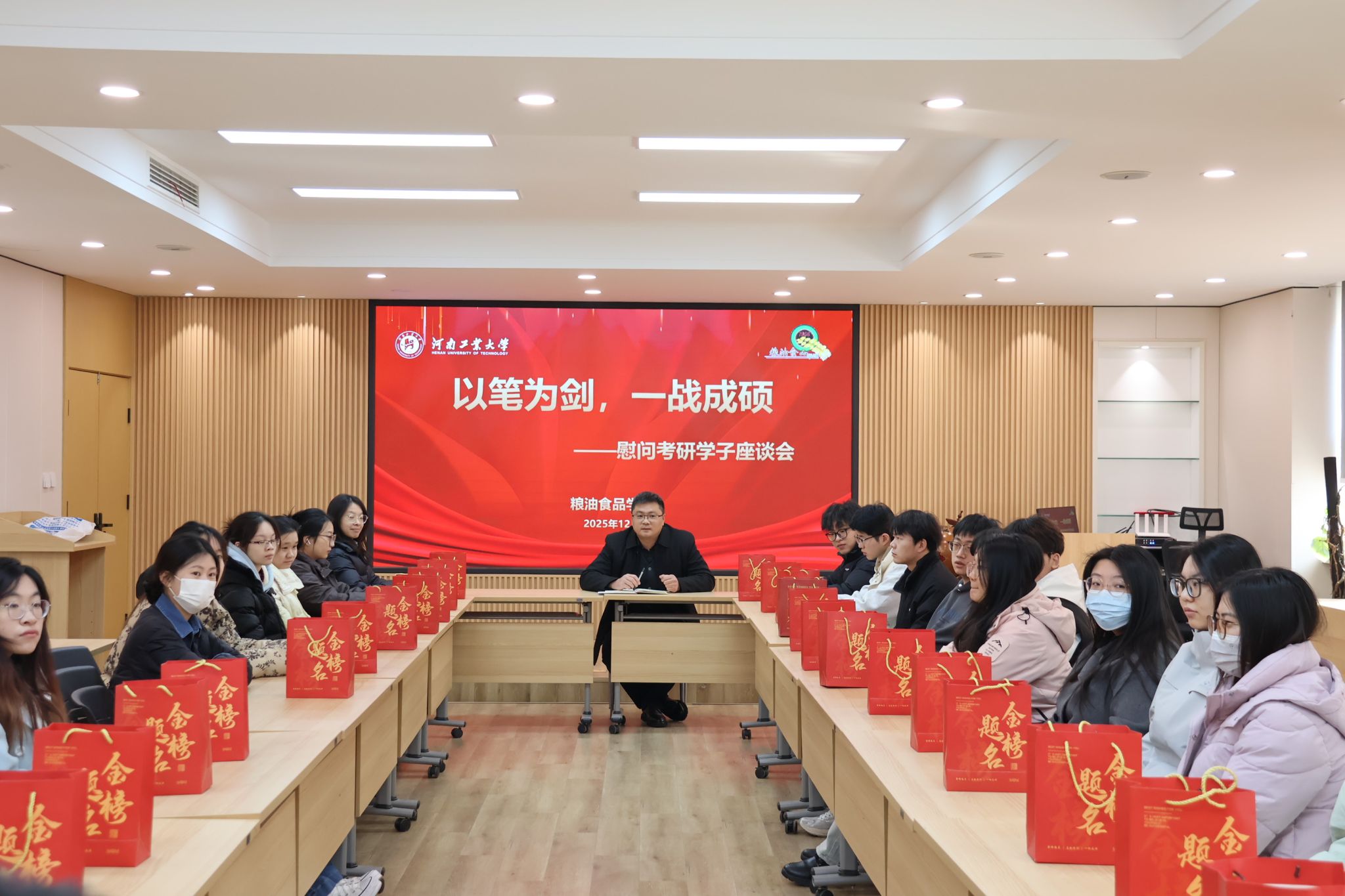 为切实关怀考研学子备考近况、舒缓备考压力,12月5日上午,粮油食品学院在惟实楼捷赛厅举办“以笔为剑,一战成硕”——慰问考研学子座谈会。学院党委书记张兴振、全体辅导员及考研学生代表参加座谈,座谈会由院团委副书记王桂英主持。