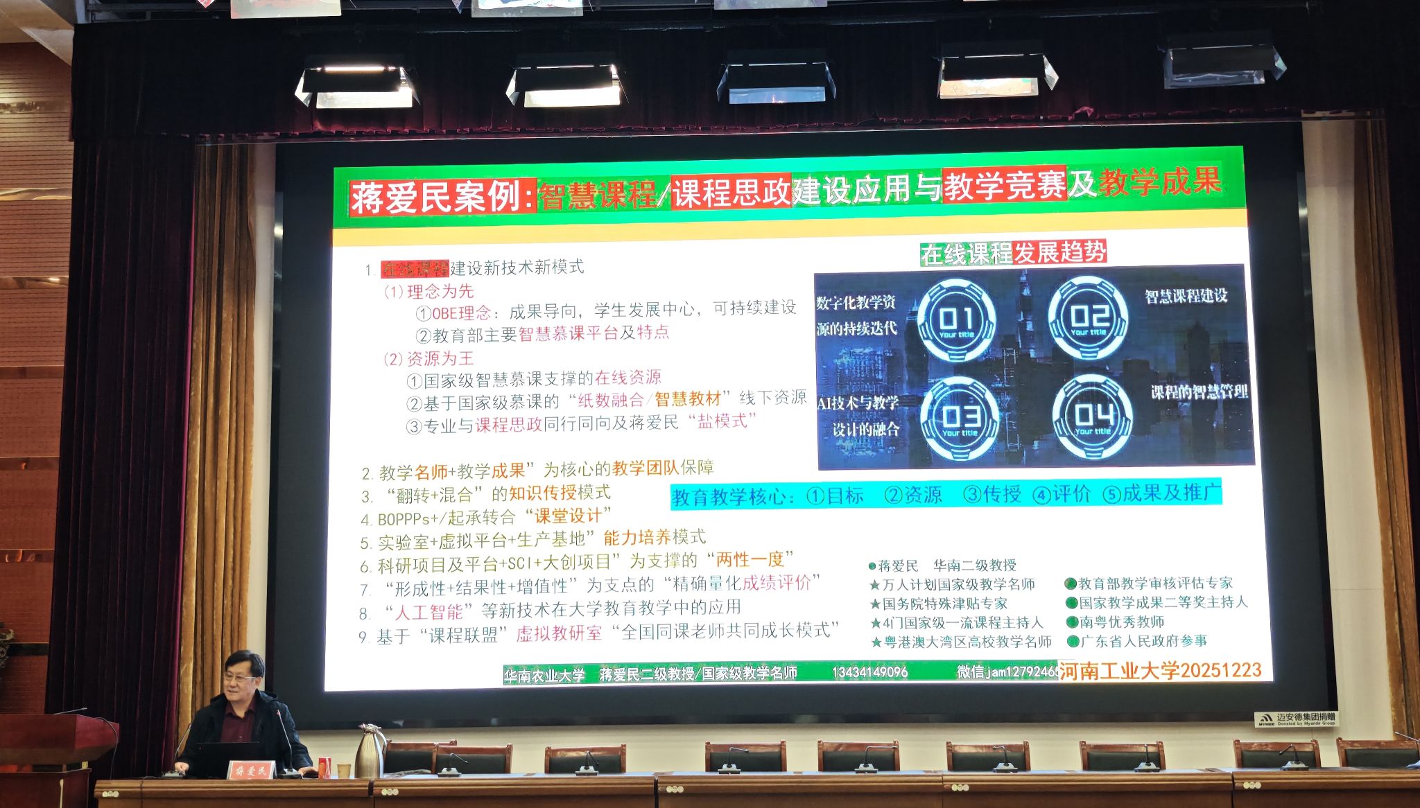 12月23日下午,河南工业大学粮油食品学院在惟实楼8527学术报告厅举办教学工作坊专题讲座,特邀国家教学名师华南农业大学蒋爱民教授担任主讲人,学院副院长关二旗主持,学院全体教师参会交流。