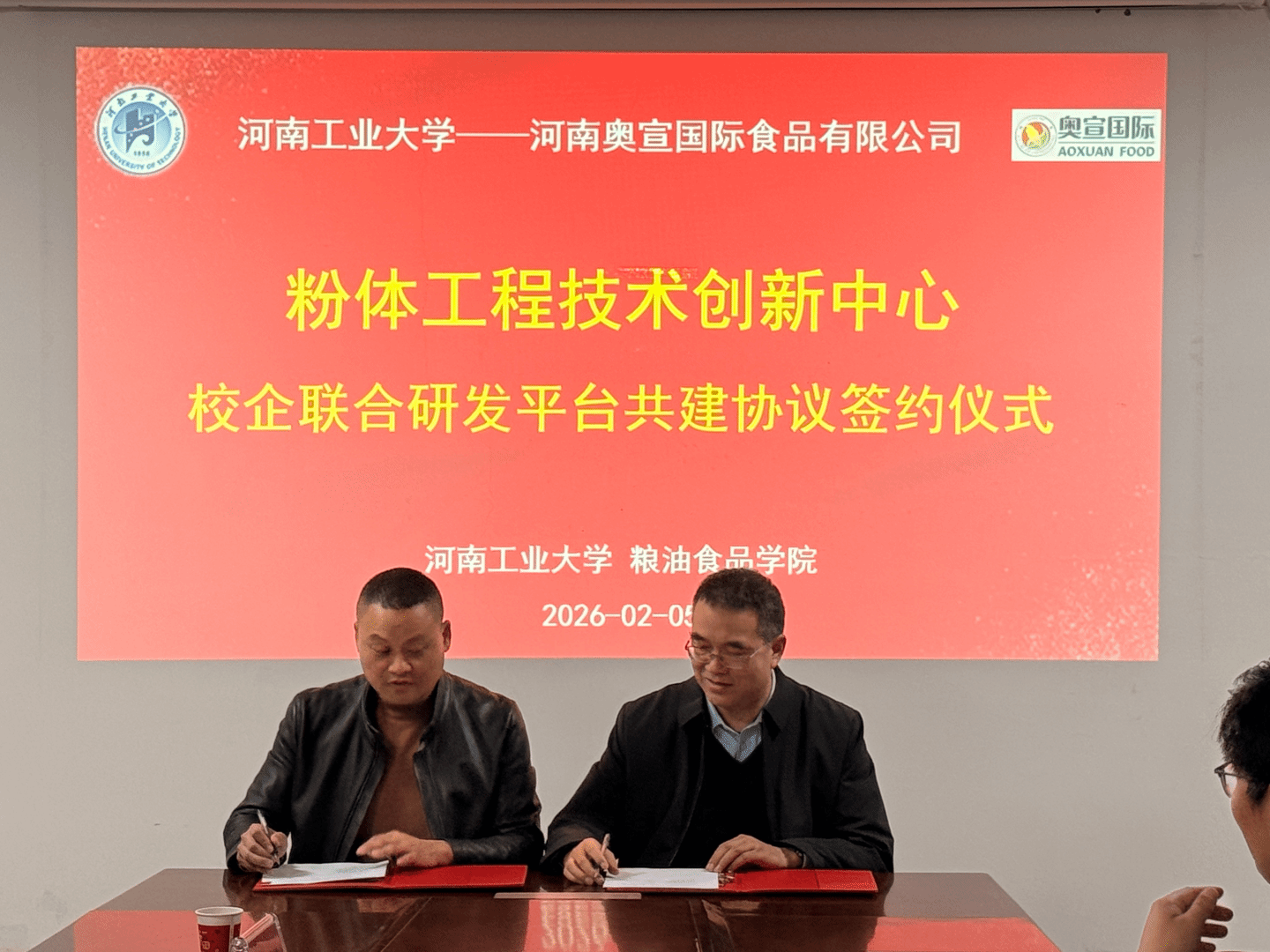 2月5日,粮油食品学院与河南奥宣国际食品有限公司共建的“粉体工程技术创新中心”签约暨揭牌仪式在惟实楼8526会议室举行。粮油食品学院院长刘昆仑、副院长关二旗,河南奥宣国际食品有限公司总经理卢伍华等校企双方代表出席仪式。仪式由粮油食品学院学术副院长陈小威主持。