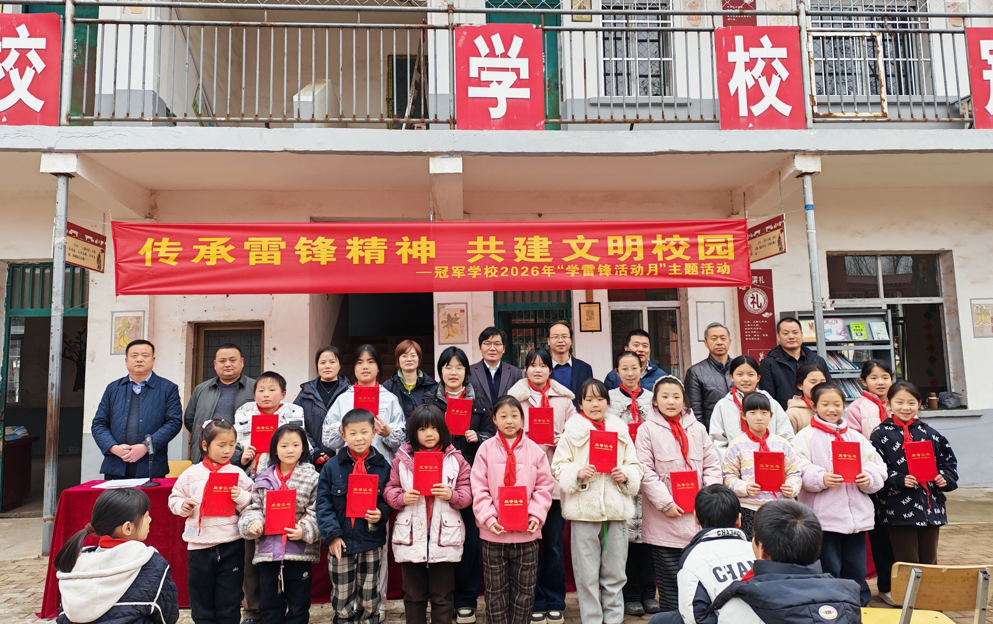 座谈会结束后,刘昆仑一行前往冠军小学,出席该校2026年“学雷锋活动月”主题实践活动。活动现场,学院一行与镇、村负责人共同为获评“学雷锋小标兵”的学生、“教学标兵”的乡村教师颁发荣誉证书及奖品,勉励广大少年儿童以雷锋为榜样,勤学善思、向上向善,扣好人生第一粒扣子,立志成长为担当民族复兴大任的时代新人;致敬扎根基层的乡村教师,感谢他们为乡村教育事业默默奉。