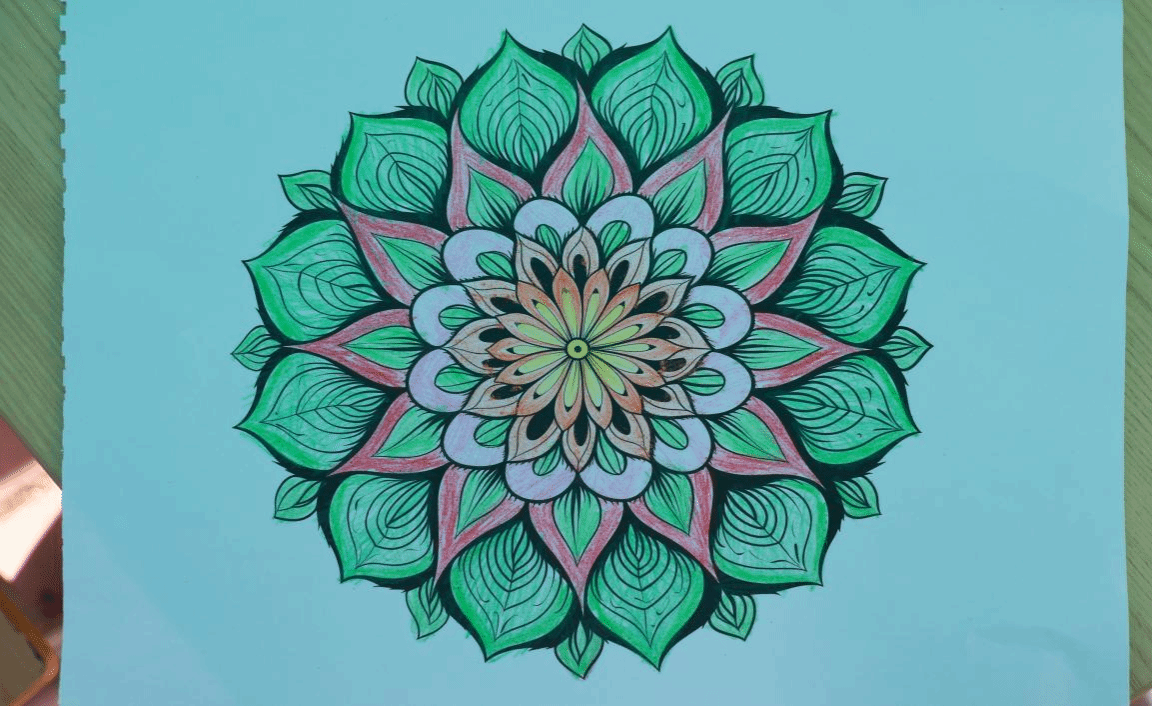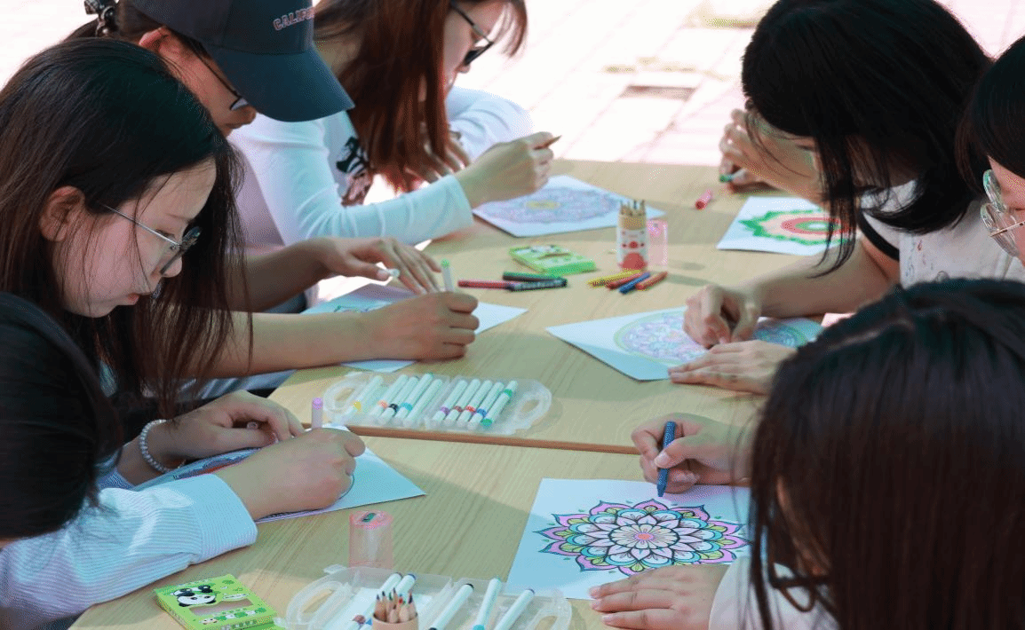 在“曼陀绘色,静心疗愈”环节,同学们纷纷挑选心仪的曼陀罗线稿,随心搭配专属色彩,全身心投入到填色创作之中。大家凝神静气、落笔轻柔,一笔一画勾勒色彩,一丝一缕沉淀思绪。内心的焦虑、烦躁与学习压力在专注创作中悄然消散。参与者在与色彩的温柔对话里,重新找回内心的平静与向上的力量。