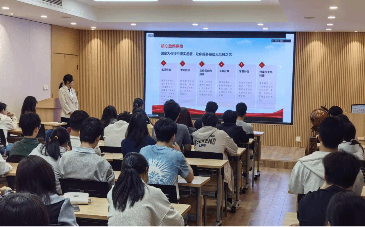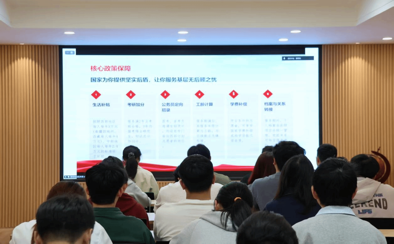 会议伊始,王桂英围绕西部计划起源发展、服务专项、政策支持、报名流程等方面进行了全面讲解。西部计划自2003年实施以来,已累计招募54万余名高校毕业生深入西部基层,开展1—3年志愿服务。随后重点介绍了乡村教育、健康乡村、基层治理、卫国戍边、服务新疆、服务西藏等八大专项,清晰地说明各岗位工作内容与优先条件。