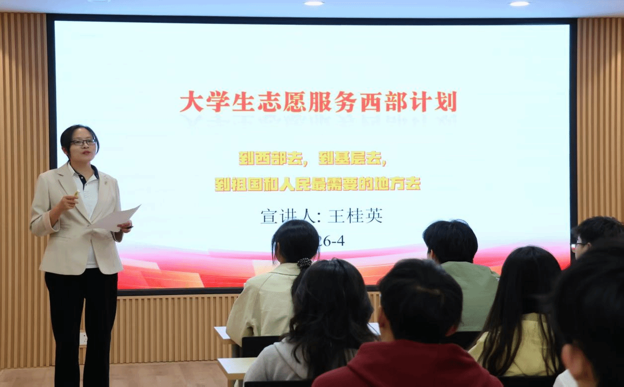 为引导广大青年学子响应国家号召,投身基层、服务西部、助力乡村振兴,4月13日,粮油食品学院于惟实楼捷赛厅举办2026年大学生志愿服务西部计划专题宣讲会。学院团委副书记王桂英、全体辅导员、2026届本科毕业生代表以及研究生代表共同参会。会议由王桂英主持。