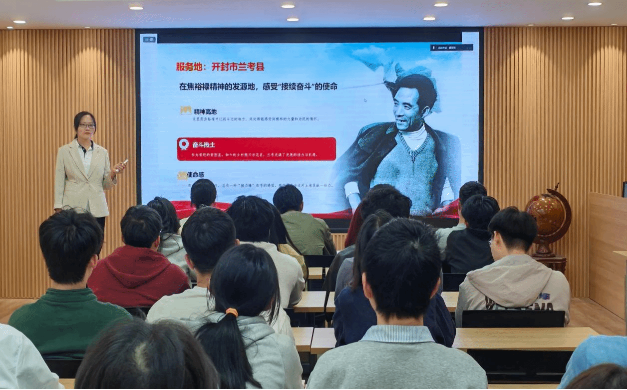 随后,优秀志愿者代表雷茗璐结合自身在开封兰考县的基层服务经历,分享了在乡镇一线的工作日常、生活保障与成长感悟,用真实经历诠释了在基层实践中淬炼成长、实现价值的生动模样,让同学们对西部计划有了更直观、更真切的认识。
